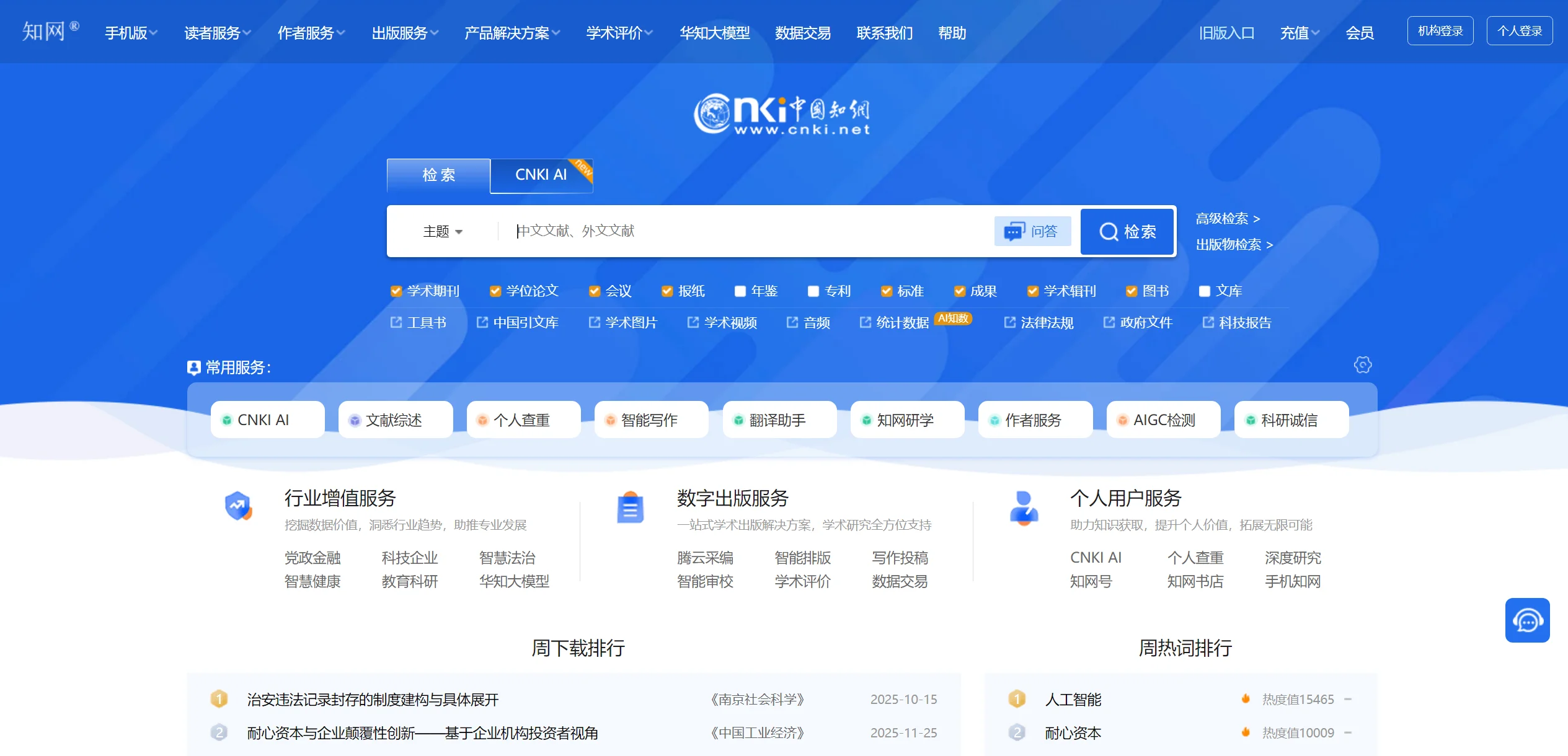 知网提供全方位的学术研究支持功能,主要包括:文献检索服务,支持关键词检索、高级检索、AI增强检索等多种检索方式;文献下载与阅读,提供CAJ和PDF两种格式的全文下载;论文查重服务,面向个人用户提供学术不端检测;AI学术助手,基于华知大模型提供智能检索、文献研读、辅助写作等功能;学术评价服务,发布高被引学者榜单、期刊影响力评价等。